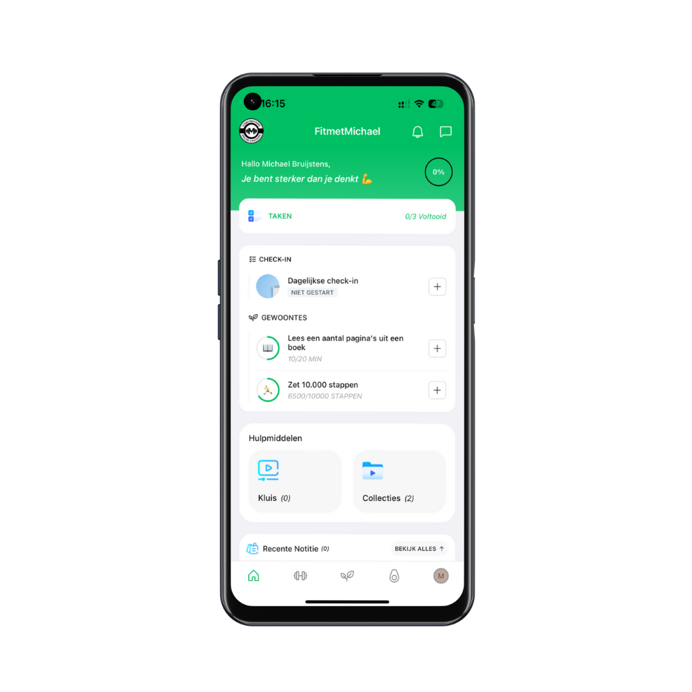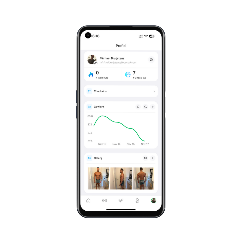 Met mijn exclusieve app maak ik gebruik van de nieuwste technologie om jouw voortgang te monitoren. Dit doe ik via de dagelijkse en wekelijkse check-ins. Daarnaast bevat de app handige tools zoals een activiteit-, doel-, en gewoonte tracker, zodat we jou optimaal kunnen begeleiden naar jouw gewenste resultaten.